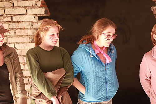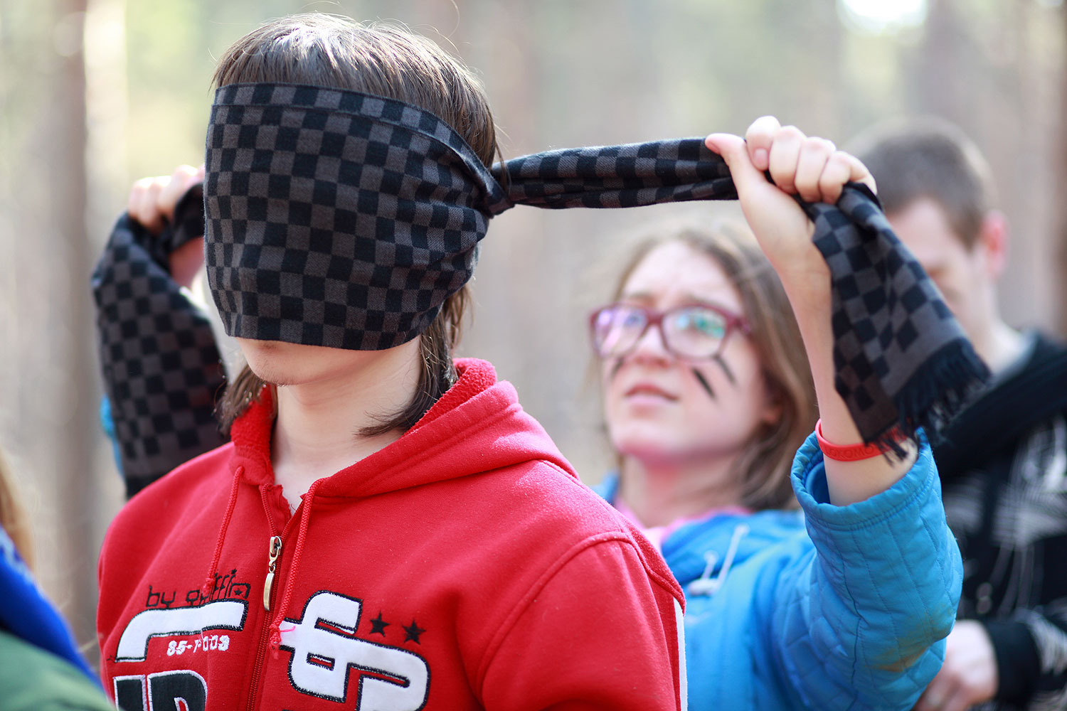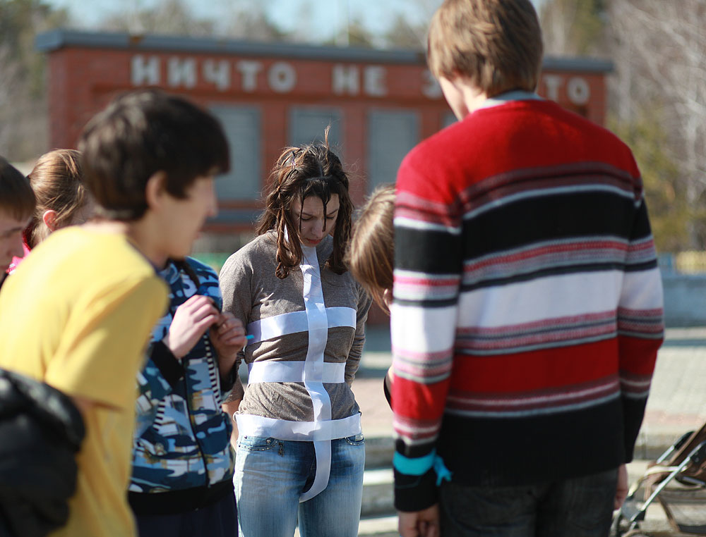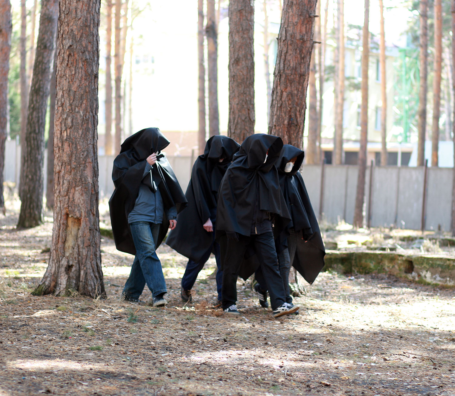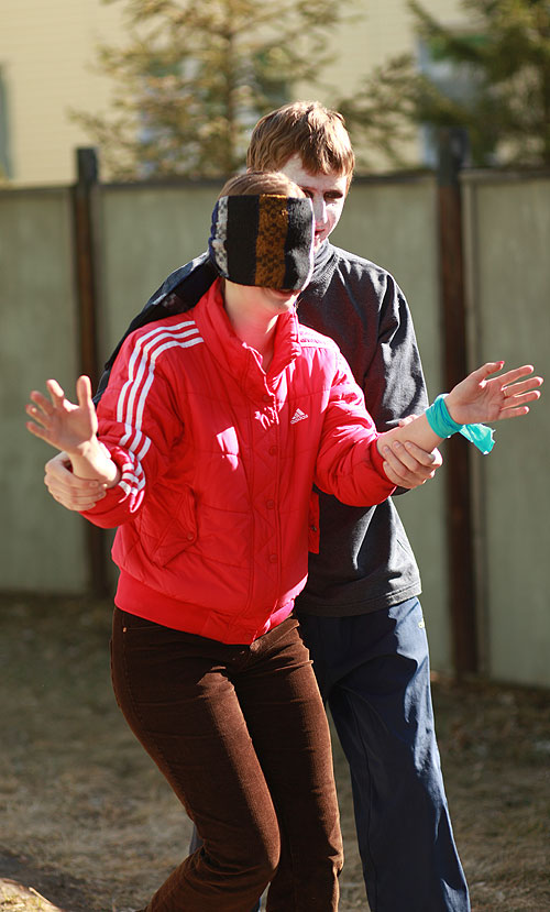 65.Вот Наташа же только еще идет с завязанными глазами к последнему этапу. Завязанные глаза позволяют заставлять посвящающихся перепрыгивать невидимые ямы и пролезать под несуществующими перекладинами.