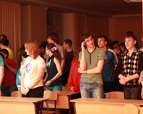 17.Первокурсники, по-моему, меньше прочих прониклись торжественностью момента. Хоть и свет им выключили, и декана перед ними на сцену выставили.