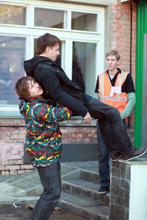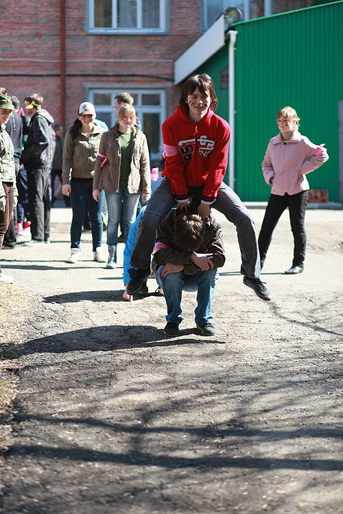 112.Перед построением, первокурсникам уже дают какие-то мелкие задания и поручения. Эти играют в чехарду.