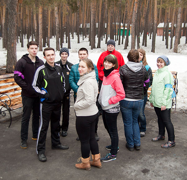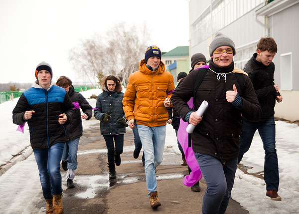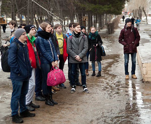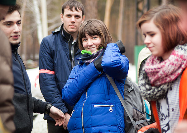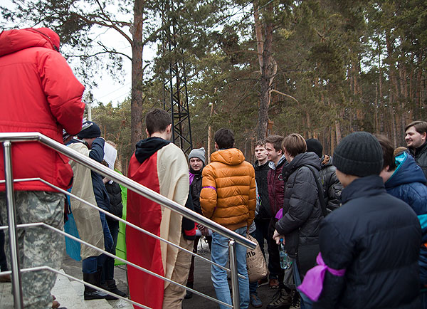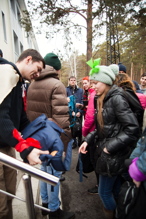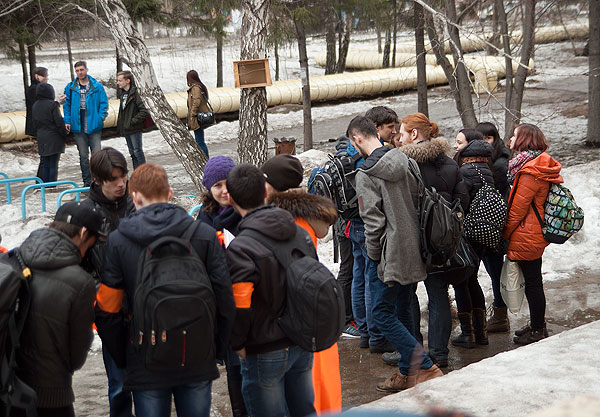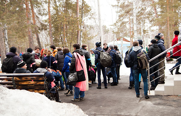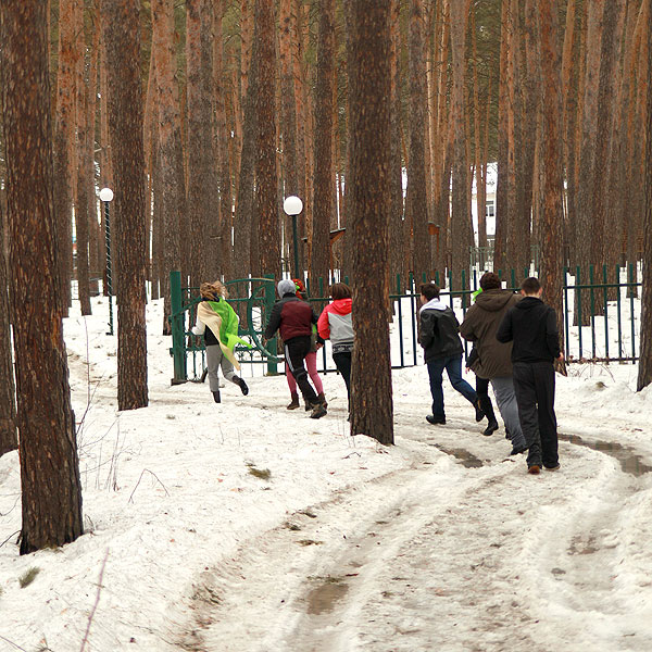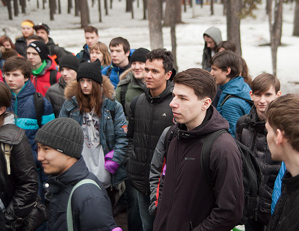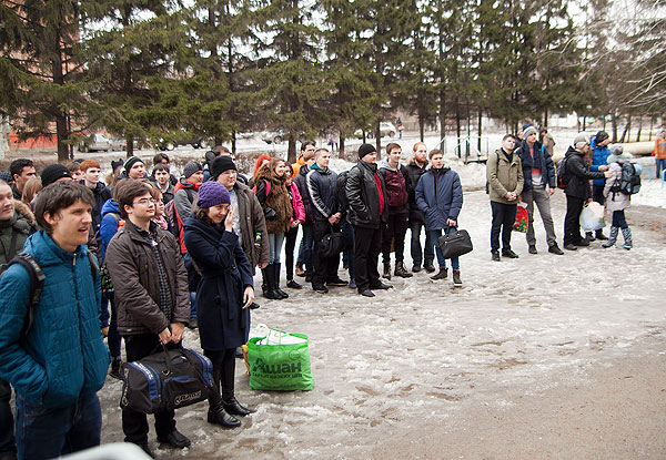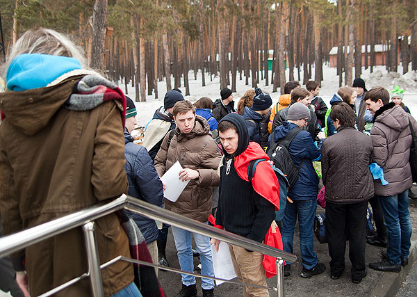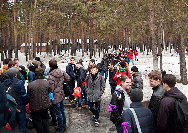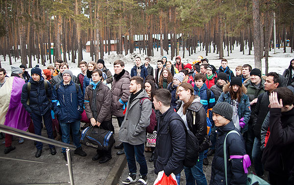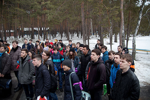 6. В этом году автобусы, которые везут ребят на базу, не смогли подъехать. И последние метров сто студентам пришлось пройти на своих двоих. Вот они подтягиваются.