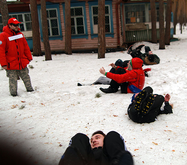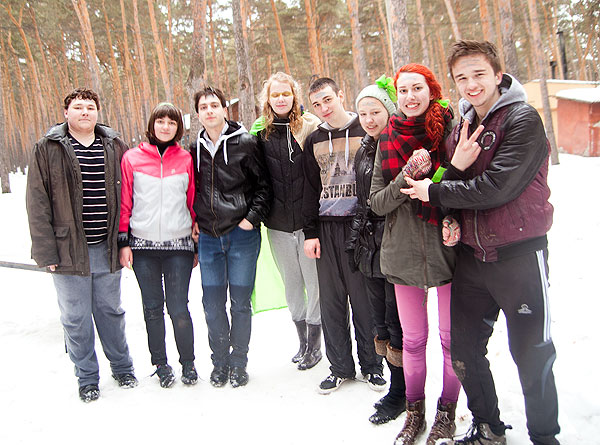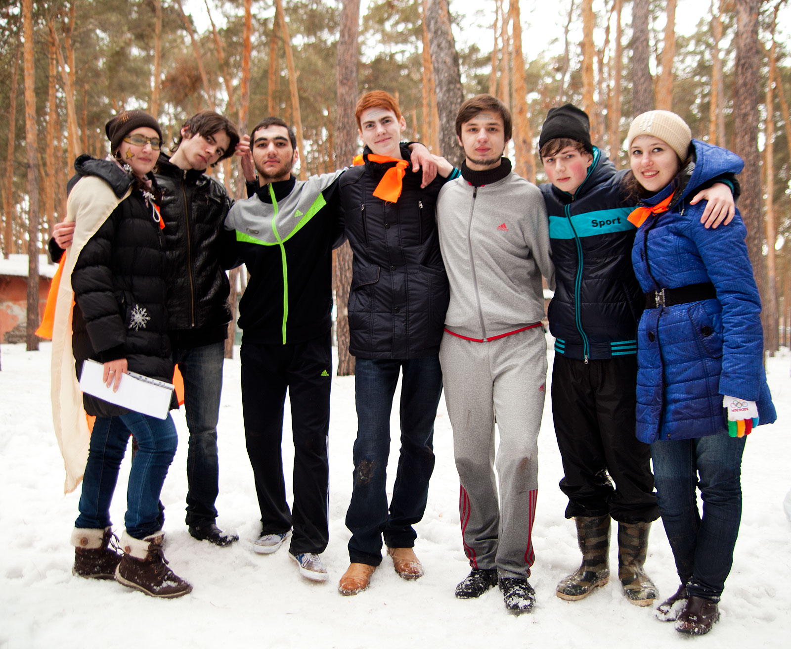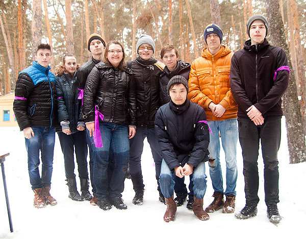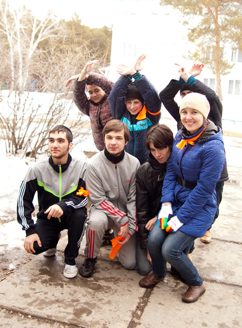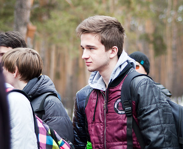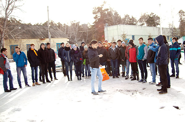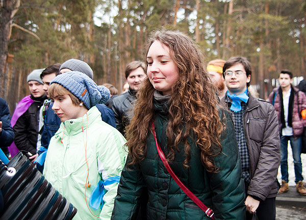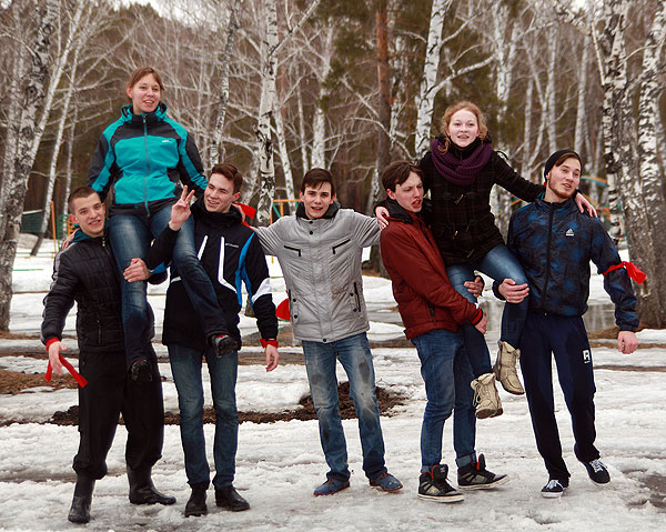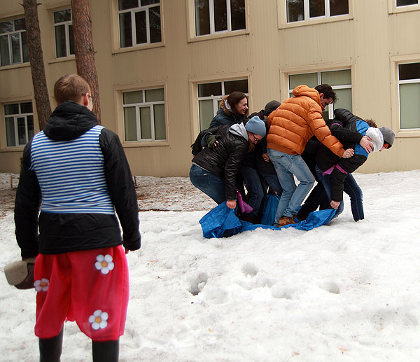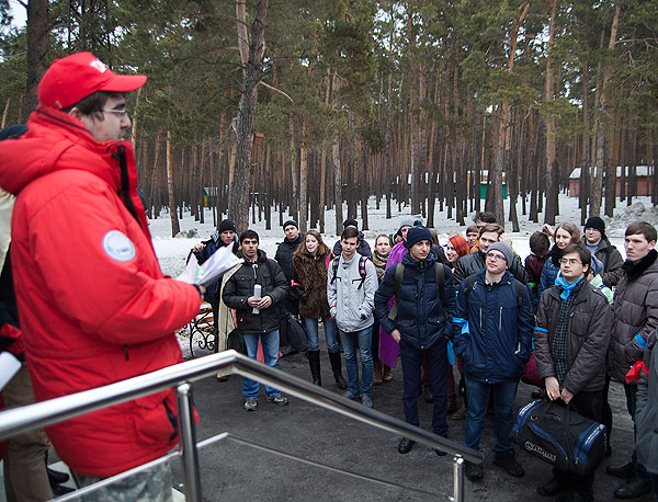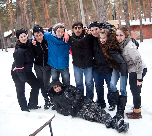 6. В этом году автобусы, которые везут ребят на базу, не смогли подъехать. И последние метров сто студентам пришлось пройти на своих двоих. Вот они подтягиваются.