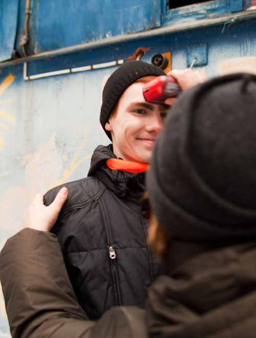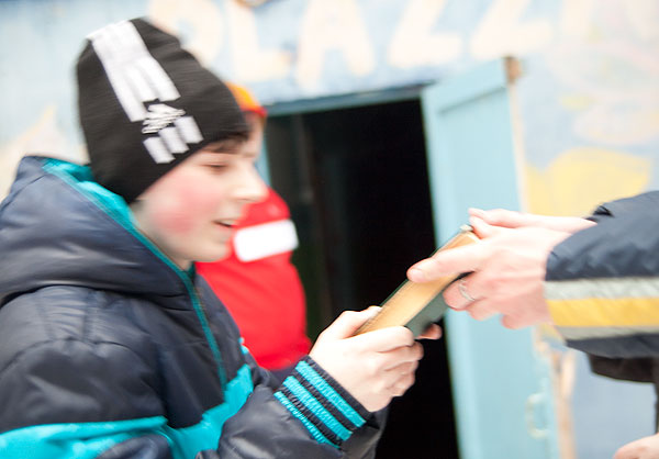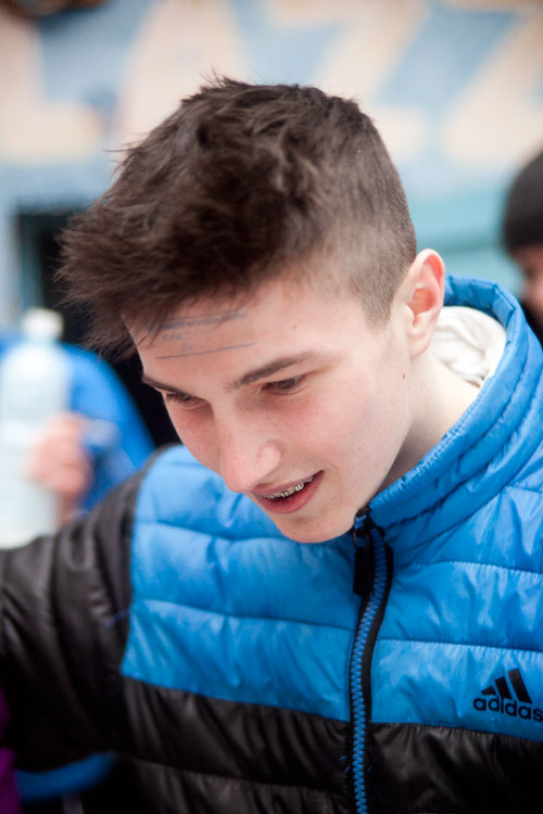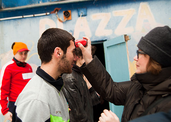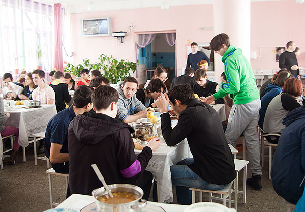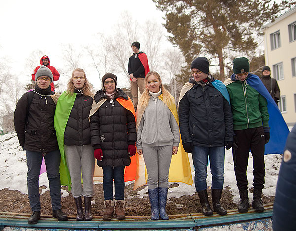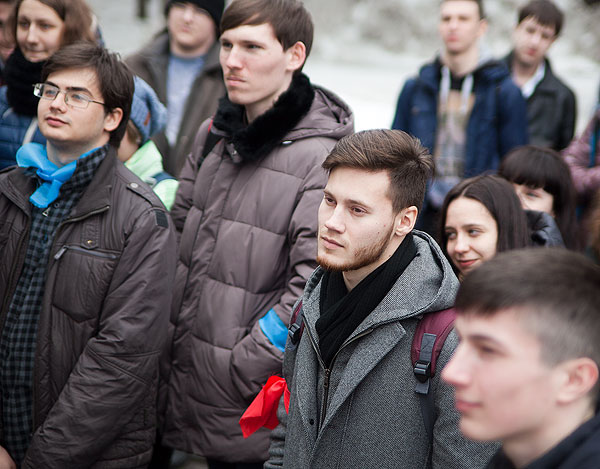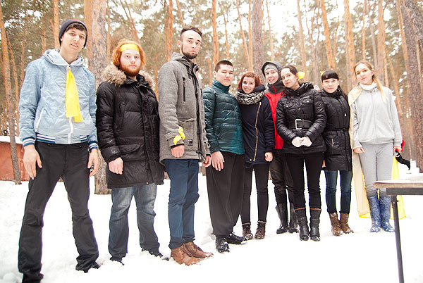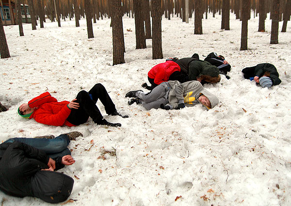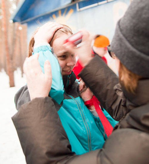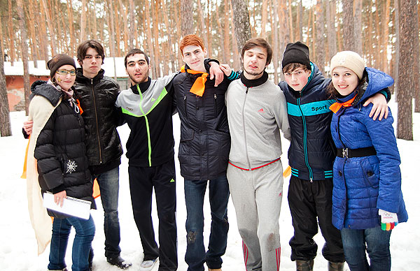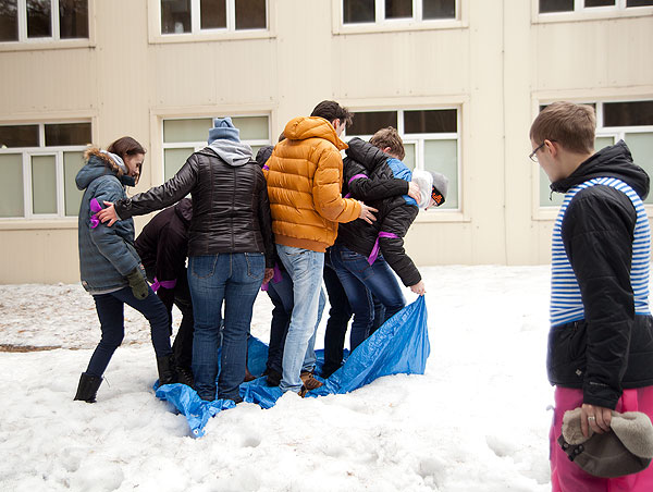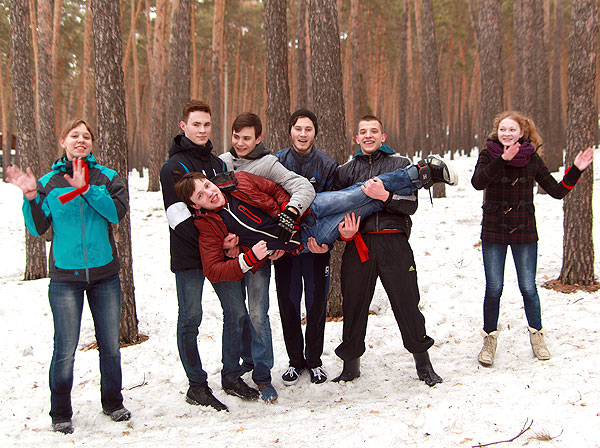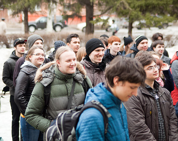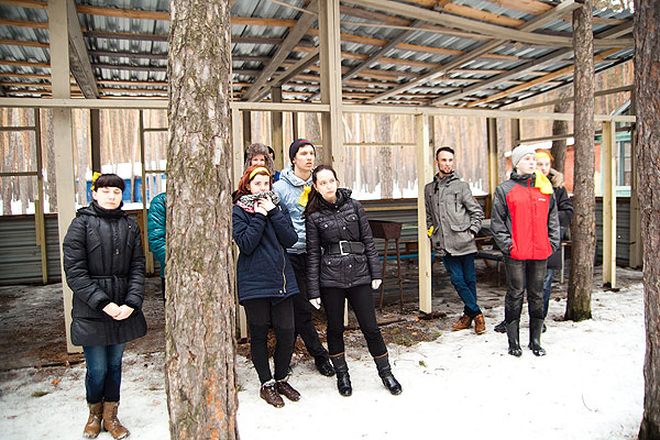 6. В этом году автобусы, которые везут ребят на базу, не смогли подъехать. И последние метров сто студентам пришлось пройти на своих двоих. Вот они подтягиваются.