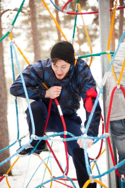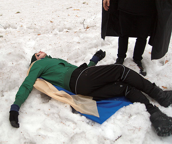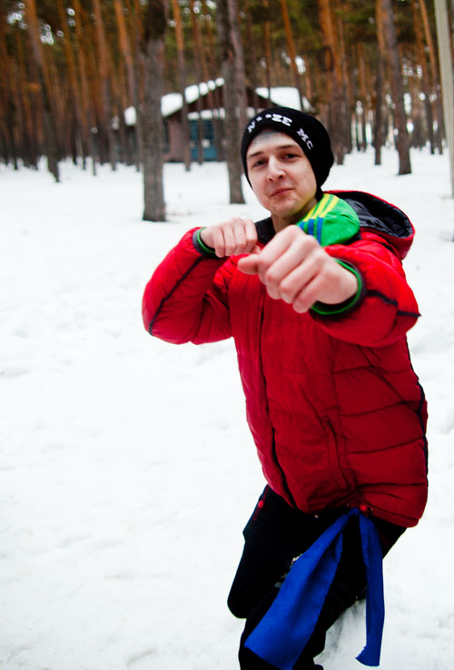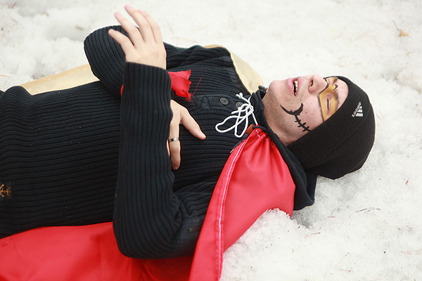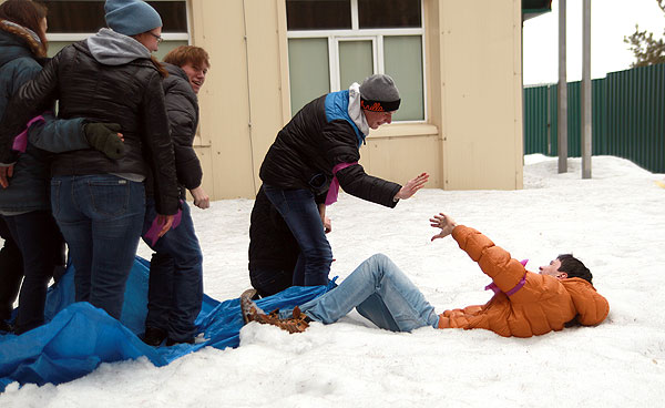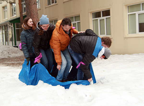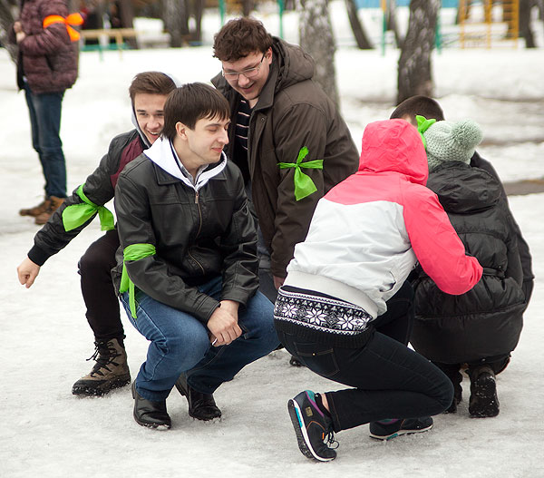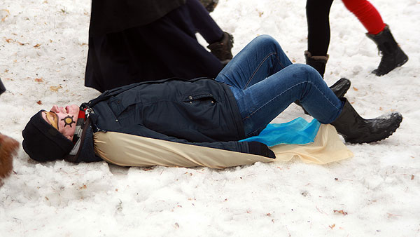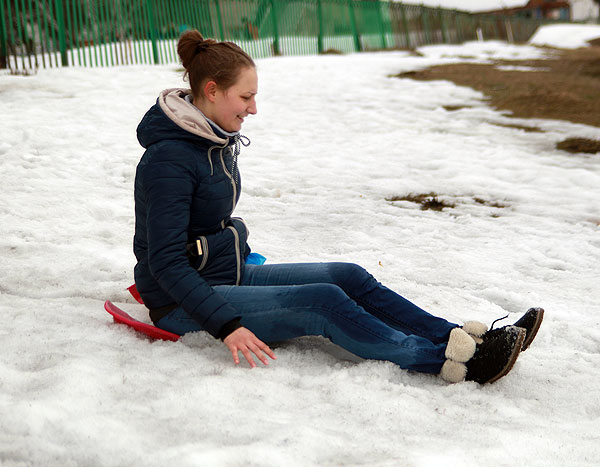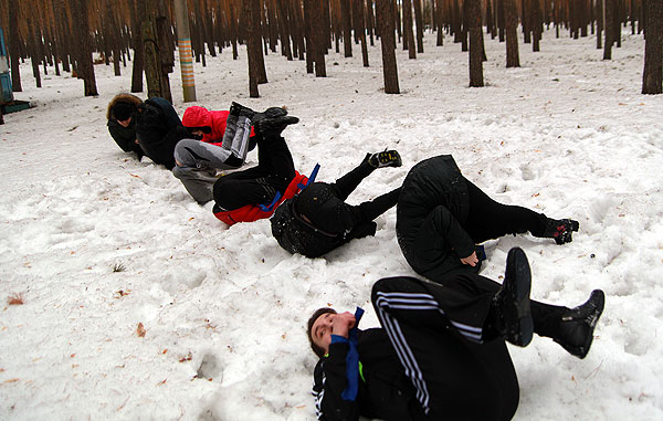 51. Скатиться, вропчем, не получилось. Снег уже подтаявший, не катится. Что делают наши первокурсники? Они не идут вальяжно вниз. Они туда катятся. Я не знаю, почему. Им такой команды никто не давал )))