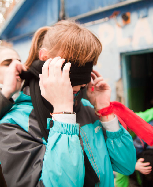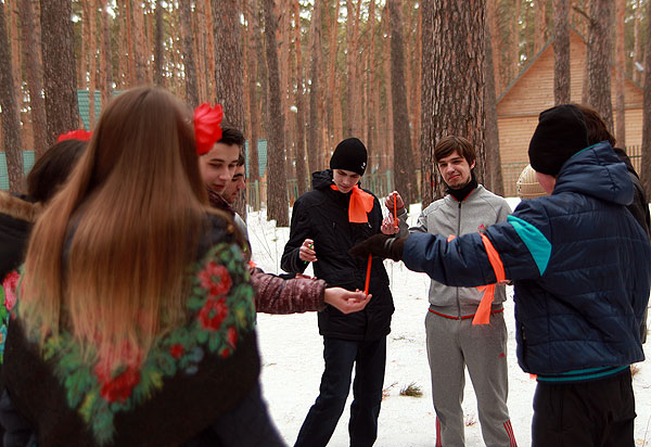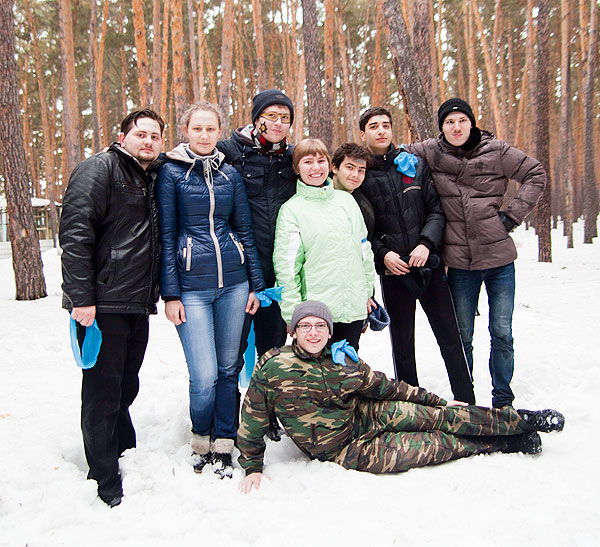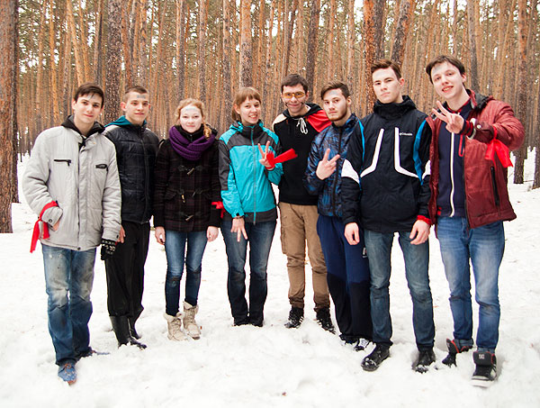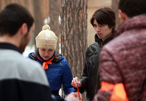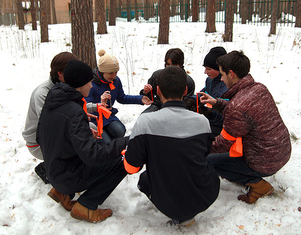 5. Вот первокурсники разделились на группы по 7-8 человек. У каждой группы свой "водящий" и, чтобы не терялись, ленточки особого цвета.